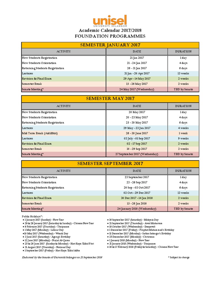 Academic Calendar 2017 For Foundation Programmes Undergraduate Postgraduate